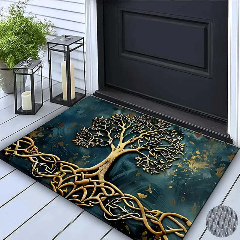 Every Gaia™ mat is a masterpiece of visual design, faithfully reproducing the rich details of a handcrafted mythical motif. The stunning golden knotwork of the roots and trunk create a striking 3D-like effect, standing out beautifully against the swirling blue-green backdrop. Constructed from high-quality, non-slip material, this mat is not only a statement piece but also a practical, long-lasting solution for high-traffic areas. Its robust build ensures it remains vibrant and protective, whether placed at your threshold or underfoot in the kitchen.