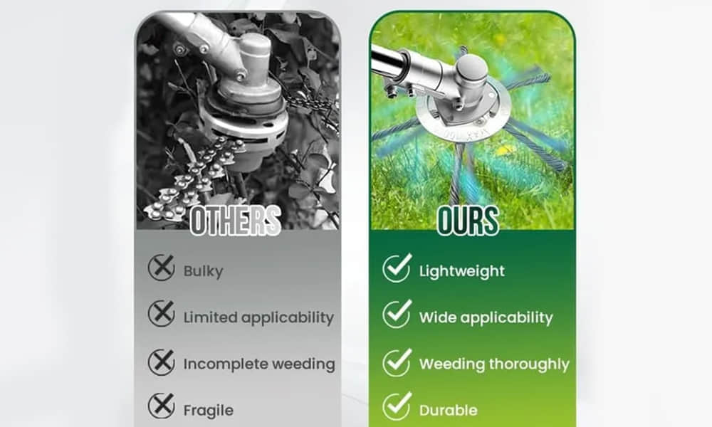 It's suitable for cutting thick grass, tall grass, lawn pruning, weed clearing, and crop harvesting—as well as handling rugged outdoor tasks like clearing rocky soil or working near concrete edges.