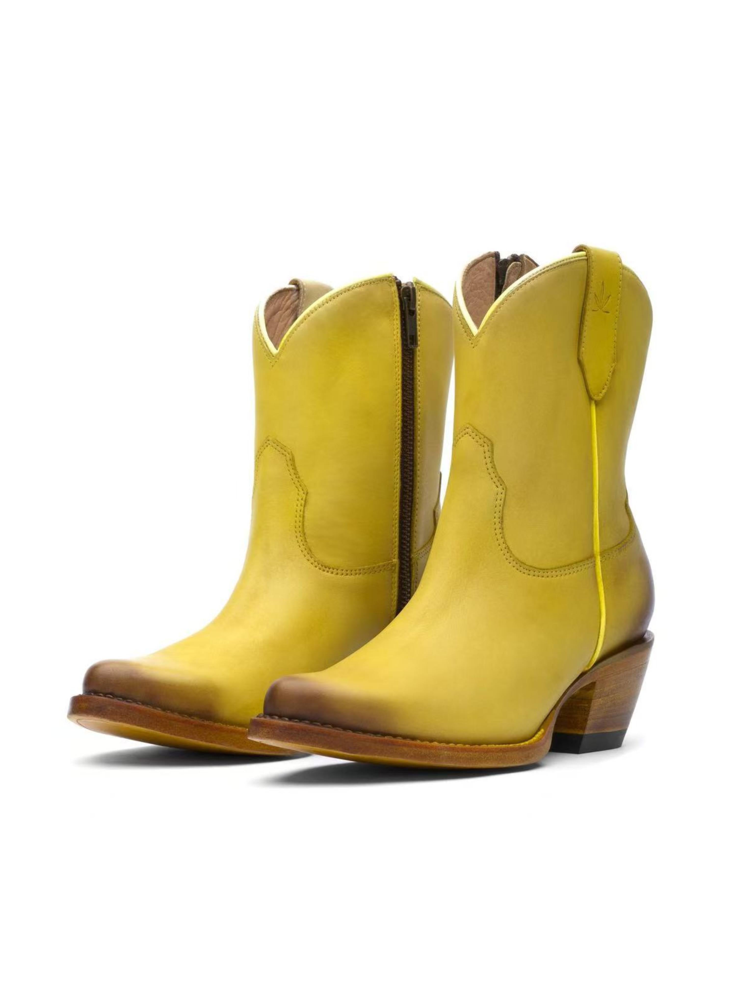 Make a bold statement with trendy lemon yellow snip toe cowboy boots featuring a convenient side zipper. Eye-catching footwear perfect for festivals, concerts, or adding vibrant Western style to any wardrobe.