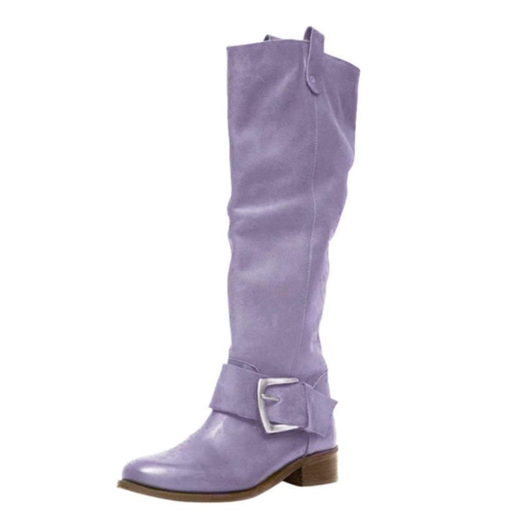 Women's retro knee high cowboy boots buckle strap chunky low heel boots