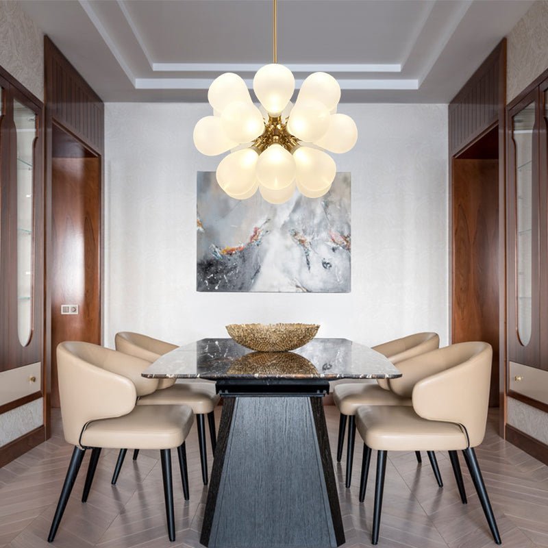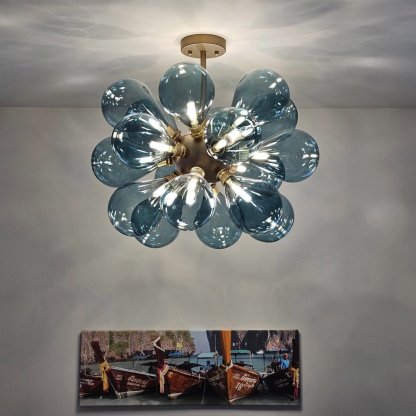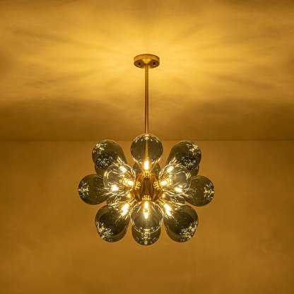 Clustered Design: The eighteen glass shades are clustered together in a cohesive arrangement, creating a striking focal point that draws the eye and commands attention. The clustered design allows for ample illumination while adding visual interest and drama to the space.