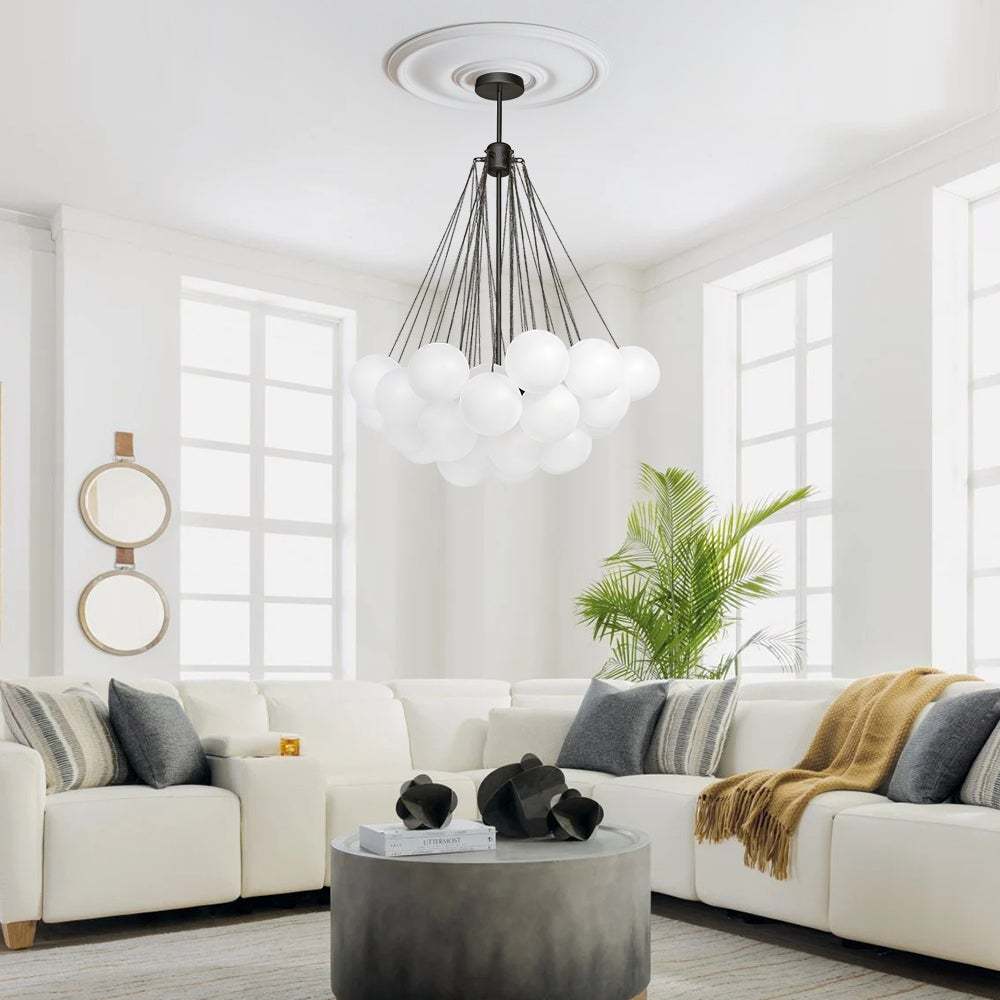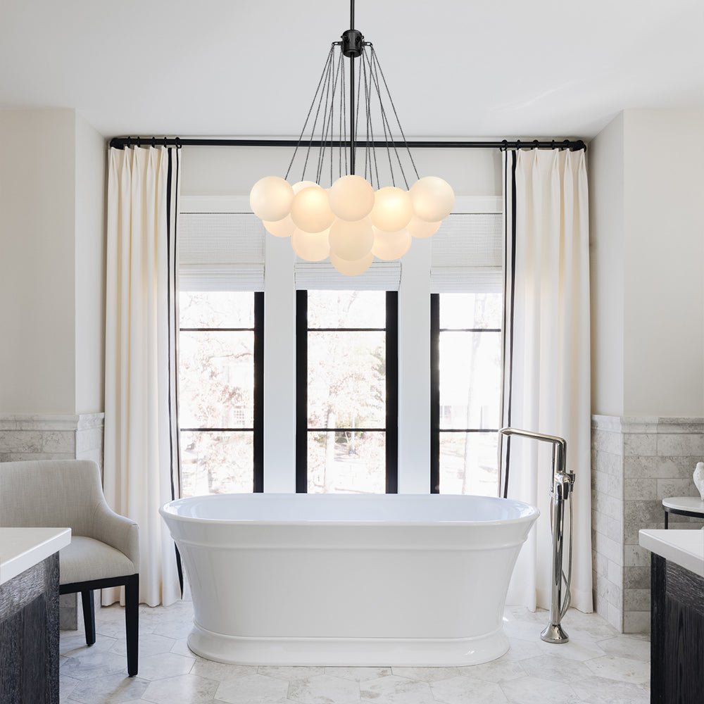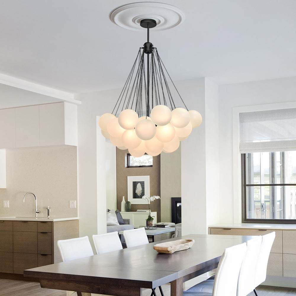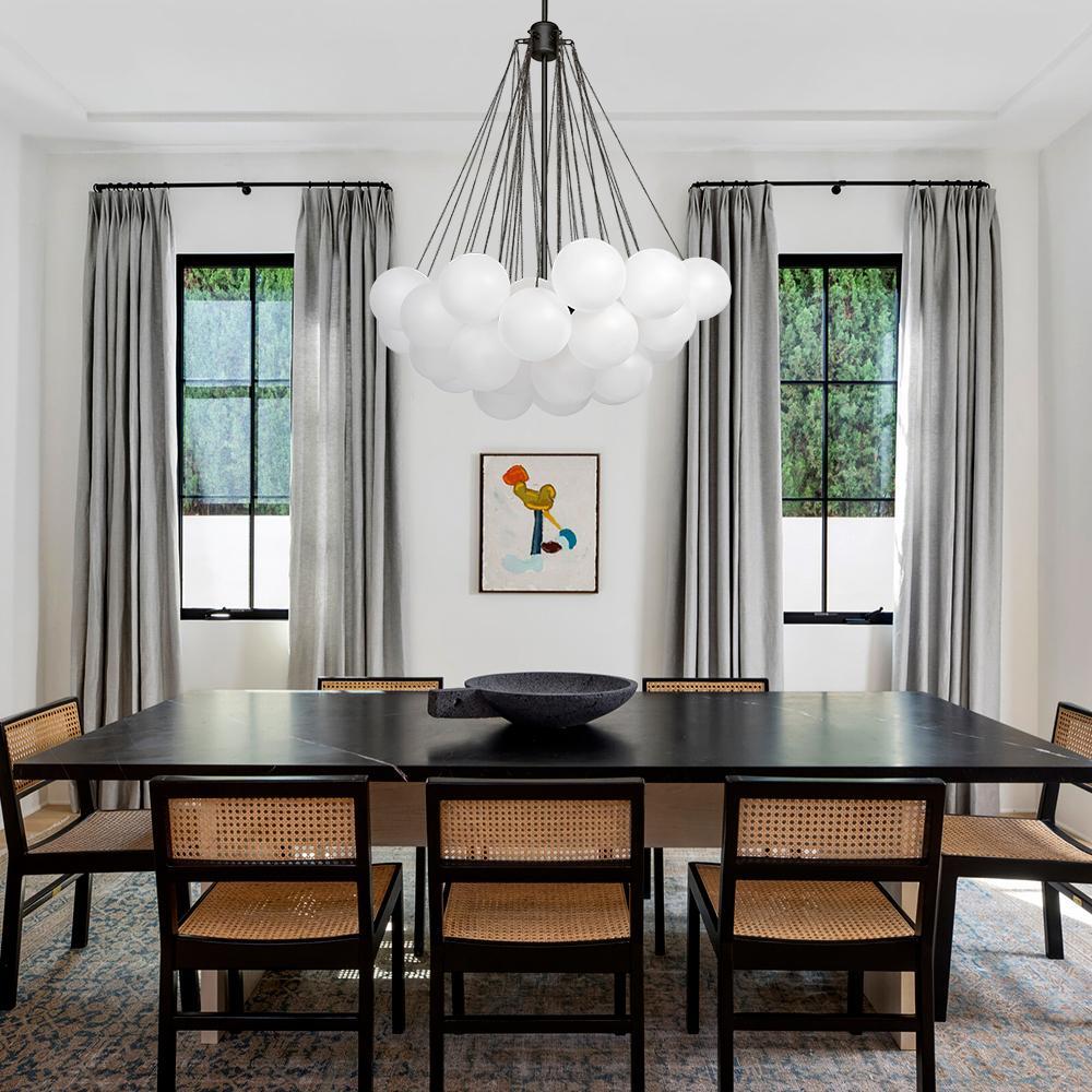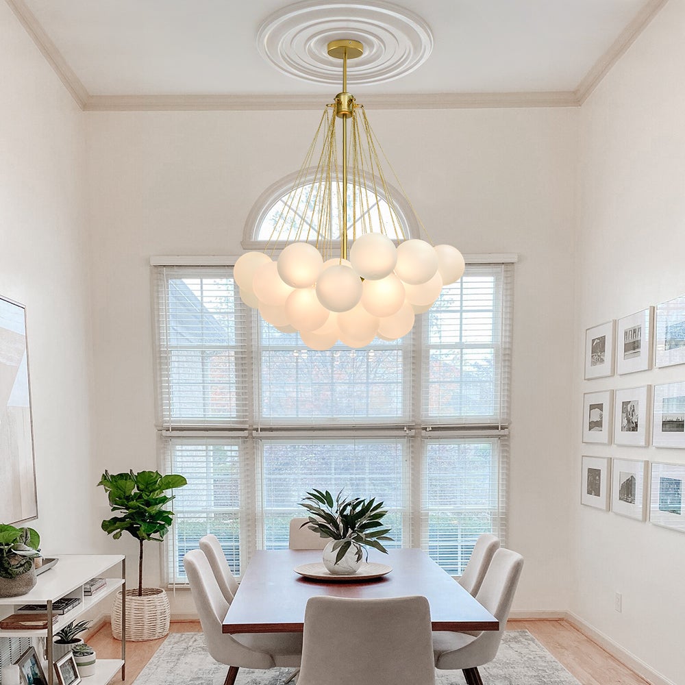 - Cluster Design: The chandelier features a cluster design, with multiple arms extending from a central point. Each arm holds a frosted bubble glass shade, creating a stunning visual effect reminiscent of floating bubbles. This unique design adds dimension and interest to the chandelier, making it a captivating centerpiece in any room.