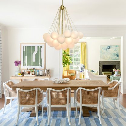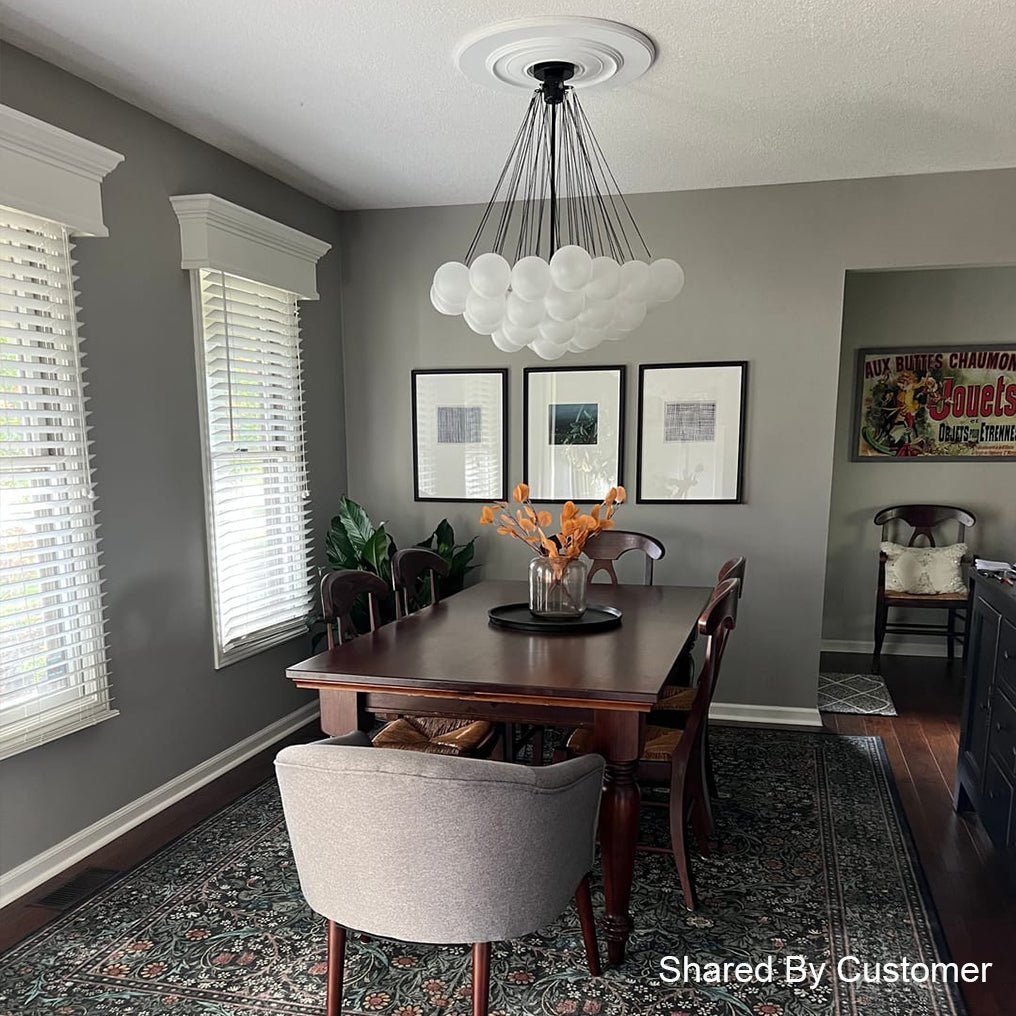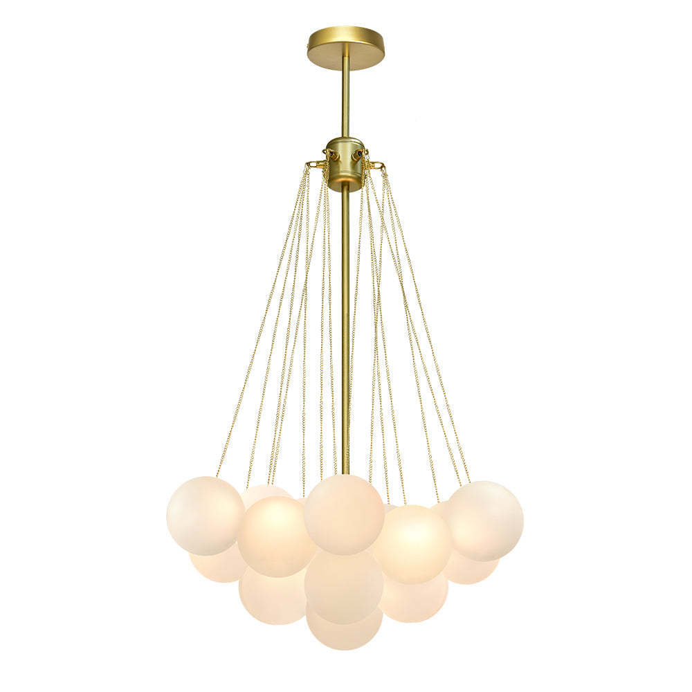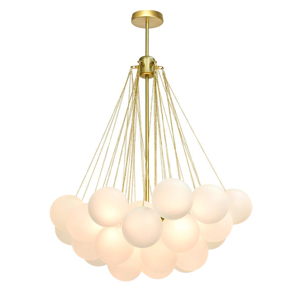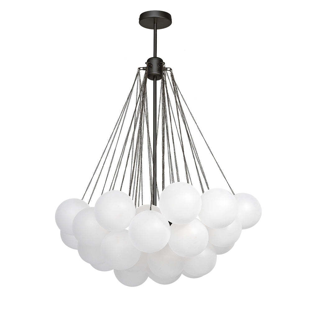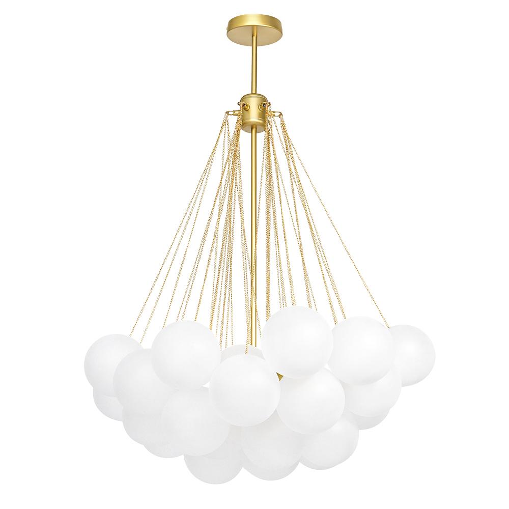 - Cluster Design: The chandelier features a cluster design, with multiple arms extending from a central point. Each arm holds a frosted bubble glass shade, creating a stunning visual effect reminiscent of floating bubbles. This unique design adds dimension and interest to the chandelier, making it a captivating centerpiece in any room.