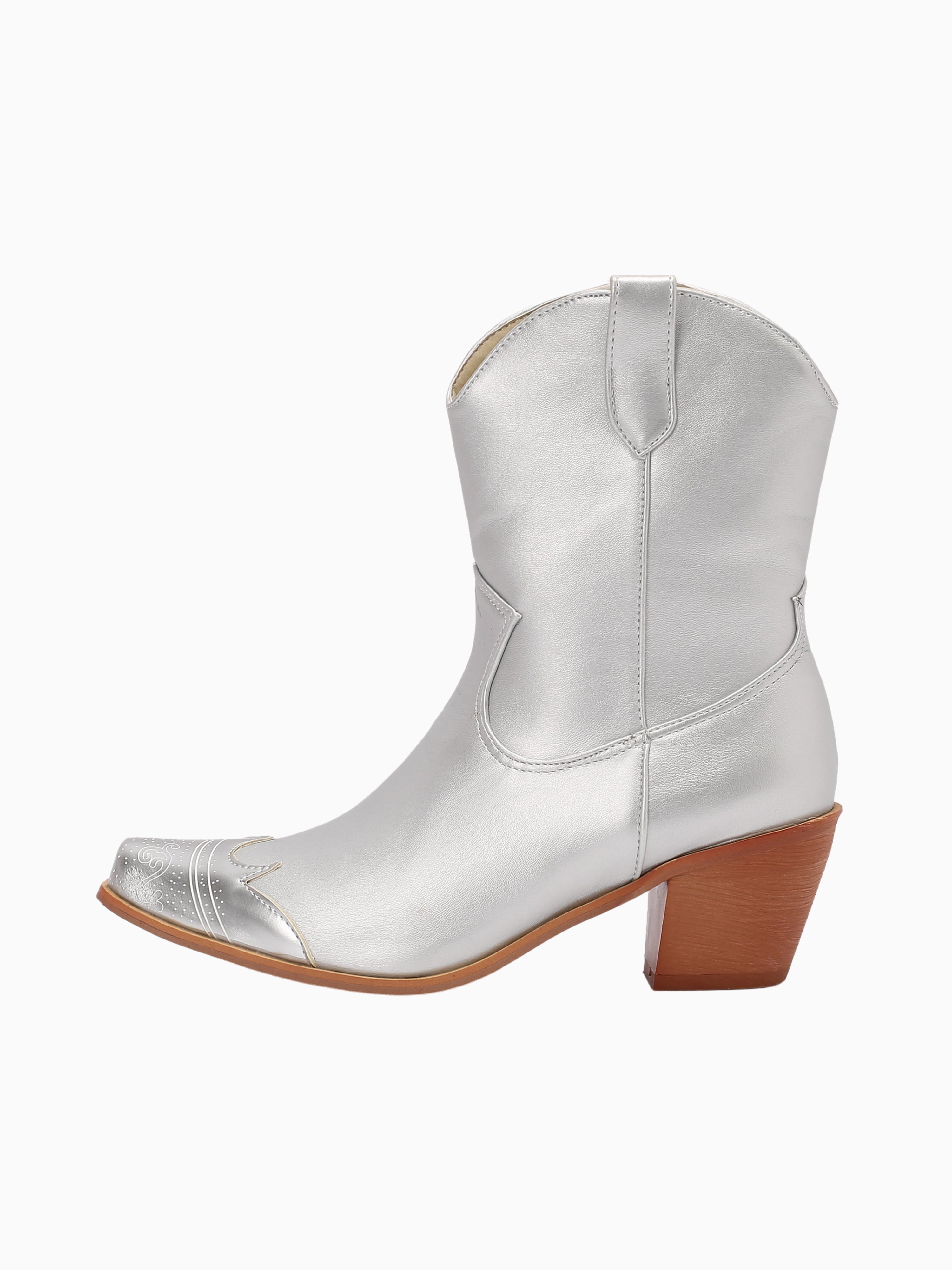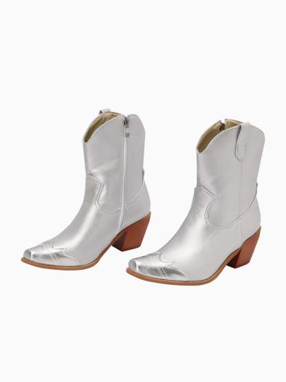 The Metallic Shine Short Silver Cowgirl Boots feature a sleek, minimalist design with a lustrous metallic finish, perfect for modern Western style.